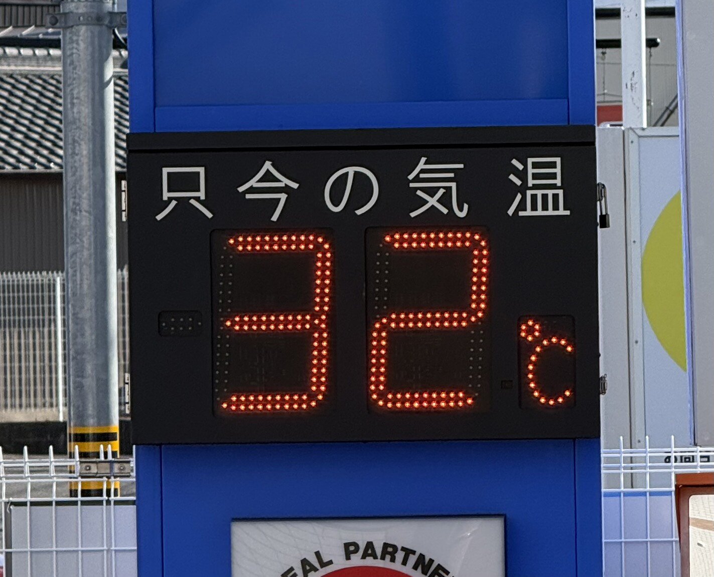 10月9日(木)午後14時45分ごろの弊社温度計は、『32℃』でした。
