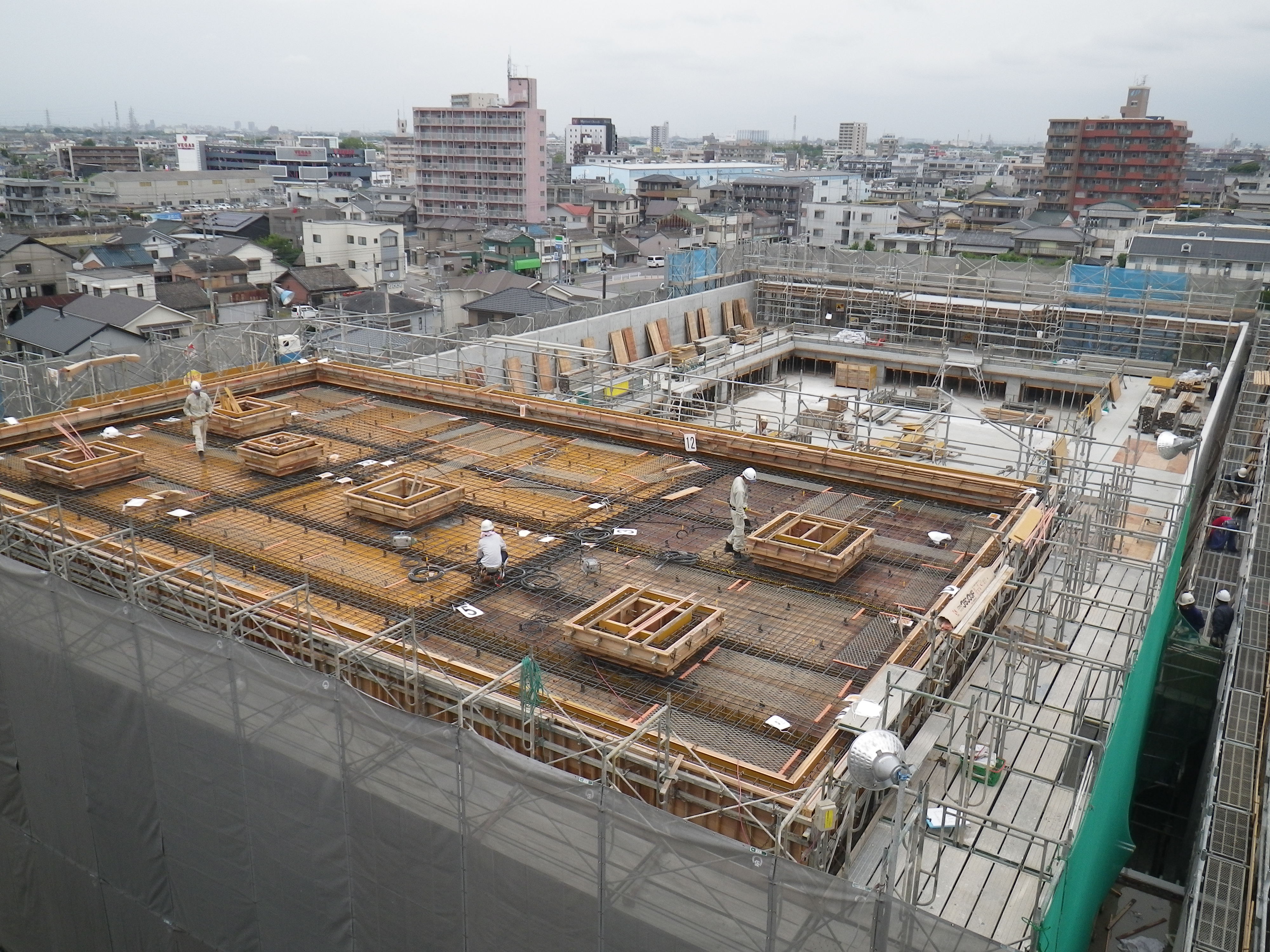 2F躯体工事・屋上鉄筋型枠完了、プール目隠し壁型枠脱型状況写真です。